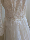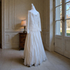 There’s something undeniably magical about a ’90s bridal moment — and this gown is the perfect example. Featuring a shimmering lace, off-the-shoulder bodice and a light, flowy chiffon skirt, she brings effortless romance with every step. And that cathedral-length train? Pure drama in the most graceful way.